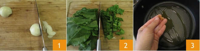 Um das Oktopusgulasch zuzubereiten, bringen Sie Wasser in einem hohen Topf zum Kochen (dies dient zum Kochen des Oktopus). In der Zwischenzeit schälen und schneiden Sie die Zwiebel in dünne Scheiben 1, dann reinigen und schneiden Sie die Kräuter 2. Begeben Sie sich zum Herd und erhitzen Sie einen Schuss Öl in einem Topf zusammen mit der zerbröselten frischen Chilischote 3.