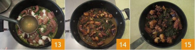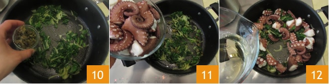 Fügen Sie nun die entsalzten Kapern 10 und die Oktopusstücke 11 hinzu. Erhöhen Sie die Hitze und löschen Sie mit Weißwein ab 12.