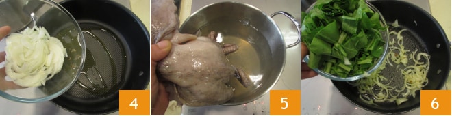 Geben Sie die Zwiebel hinein und lassen Sie sie bei schwacher Hitze 5 Minuten schmoren, während Sie umrühren 4. In der Zwischenzeit können Sie den Oktopus im kochenden Wasser blanchieren 5 und ihn 5 Minuten kochen lassen. Geben Sie währenddessen auch die Kräuter in die Pfanne 6