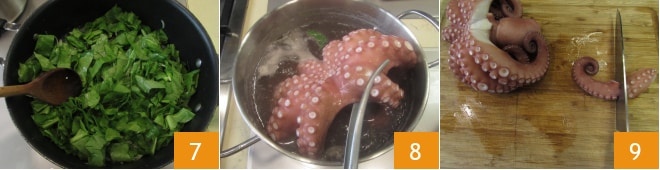 und rühren Sie gelegentlich um, damit sie zusammenfallen 7. Nach Ablauf der Zeit den Oktopus abtropfen lassen, ohne das Kochwasser wegzuschütten 8, und grob zerkleinern 9.
