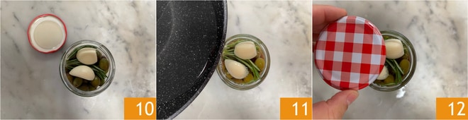 Würzen Sie mit Knoblauch und Rosmarin 10 und sobald die Salzlake kalt ist, gießen Sie sie über die Oliven 11. Verschließen Sie jedes Glas mit dem Deckel 12 und stellen Sie sie an einen kühlen, trockenen Ort, geschützt vor Licht. Lassen Sie Ihre Oliven in Salzlake mindestens einen Monat lang ziehen, bevor Sie sie verzehren.