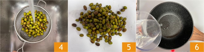 Entfernen Sie das Wasser von den Oliven, spülen Sie sie ab 4 und legen Sie sie auf ein sauberes Baumwolltuch, um sie zu trocknen 5. Bereiten Sie die Salzlake vor, indem Sie Wasser in einem kleinen Topf erhitzen 6.