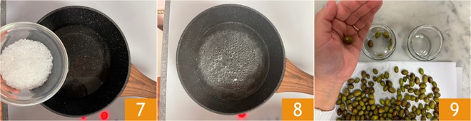 Fügen Sie auch das Salz hinzu 7 und bringen Sie es zum Kochen 8. Wenn die Salzlake kocht, schalten Sie die Hitze aus und lassen Sie sie abkühlen. Verteilen Sie die Oliven in den sterilisierten Gläsern 9 gemäß den ministeriellen Richtlinien, die Sie am Ende des Rezepts finden.