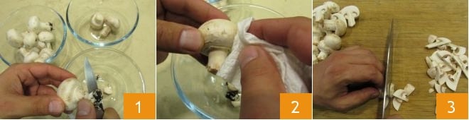Um die Omelette Königin zuzubereiten, beginnen Sie mit dem Reinigen der Champignon-Pilze: Mit einem scharfen Messer mit glatter Klinge beginnen Sie, den erdigen Teil am Stiel zu entfernen 1, indem Sie ihn sanft abschaben, bis die Erde entfernt ist. Entfernen Sie die wenigen verbleibenden Erdkrümel mit einem Baumwolltuch 2 oder einem Pinsel. Schneiden Sie die Pilze dünn 3 und legen Sie sie beiseite.