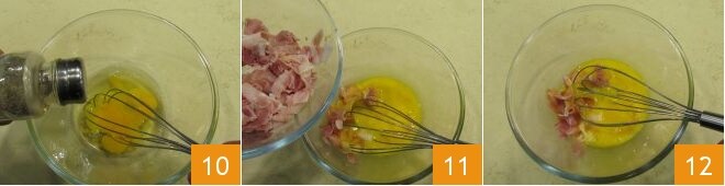 Jetzt, da die Füllung fertig ist, widmen Sie sich der Zubereitung einer Omelette nach der anderen. Brechen Sie also in einer Schüssel zwei Eier (um eine Omelette herzustellen), salzen und pfeffern Sie 10, schlagen Sie mit dem Schneebesen und fügen Sie auch ein wenig Schinken hinzu 11, gut mischen 12,