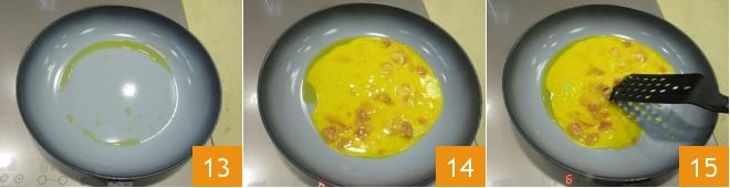 erhitzen Sie dann eine Pfanne mit einem Schuss Öl 13, gießen Sie die Eimasse hinein 14. Schieben Sie mit einem Spatel die noch flüssige Masse auf eine Seite 15.
