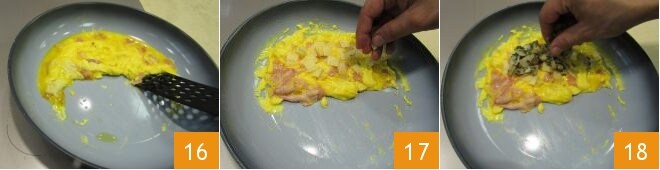 Wenn das Ei leicht gestockt ist 16, füllen Sie es mit ein paar Edamer-Würfeln 17 und ein paar gebratenen Pilzen 18.