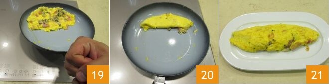 Neigen Sie nun die Pfanne und geben Sie energische Schläge auf den Griff mit einer geschlossenen Faust, während Sie mit der anderen Hand den Pfannengriff festhalten 19, um die Omelette auf sich selbst zu falten 20. Durch diese Schläge wird der Teil am Rand der Pfanne nach innen geklappt, wodurch die Omelette entsteht. Um eine perfekte Omelette mit der traditionellen Technik herzustellen, braucht es Übung, anfangs können Sie sich mit einem Spatel helfen, um sie aufzurollen. Fahren Sie mit den restlichen fort. Die Omelette Königin ist fertig, servieren Sie sie heiß 21!