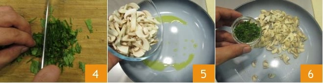 Hacken Sie auch die Petersilie 4, erhitzen Sie dann eine Pfanne mit einem Schuss Olivenöl, geben Sie die in Scheiben geschnittenen Champignons dazu 5. Braten Sie die Pilze 3-4 Minuten in der Pfanne an und würzen Sie sie dann mit der gehackten Petersilie 6.