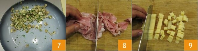 Die Pilze sind fertig, legen Sie sie beiseite 7. Schneiden Sie den gekochten Schinken in Streifen 8, dann den Edamer in Würfel 9.