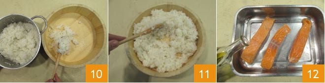 Geben Sie den Reis in das Hangiri, die spezielle Holzschüssel 10, und rühren Sie vorsichtig mit dem Holzlöffel um, um den Reis abzukühlen 11: der Reis sollte nicht vollständig abkühlen. Gehen Sie zur Vorbereitung des Fisches für die Füllung über: Würzen Sie den Lachs mit Öl 12, Salz und Pfeffer und wenden Sie die Filets auf allen Seiten, um sicherzustellen, dass sie gleichmäßig gewürzt sind.
