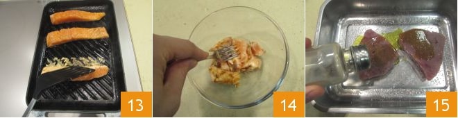 Heizen Sie den Grill gut vor und grillen Sie den Lachs für 3 Minuten auf jeder Seite 13, dann legen Sie ihn auf ein Blatt Küchenpapier, um das überschüssige Öl zu absorbieren. Wenn gewünscht, geben Sie ihn in eine Schüssel und zerkleinern Sie ihn grob mit einer Gabel 14. Verfahren Sie auf die gleiche Weise mit dem Thunfisch: Würzen Sie die Filets mit Öl, Salz und Pfeffer 15,