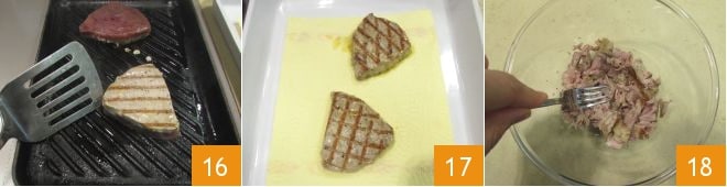 grillen Sie sie für 3 Minuten auf jeder Seite 16, tupfen Sie sie vorsichtig mit Küchenpapier ab 17 und zerkleinern Sie den Thunfisch in einer Schüssel mit den Zinken einer Gabel 18.
