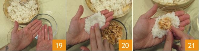 Jetzt können Sie mit dem Zusammenstellen der Onigiri beginnen: Befeuchten Sie Ihre Hände in einer Schüssel mit Wasser, um den Reis besser handhaben zu können 19, dann reiben Sie Ihre Handflächen mit etwas Salz, um den Reis beim Formen der Bällchen zu würzen. Nehmen Sie eine Handvoll Reis und flachen Sie ihn in Ihrer Handfläche ab 20; fügen Sie einen großzügigen Löffel zerkleinerten Lachs oder Thunfisch hinzu 21