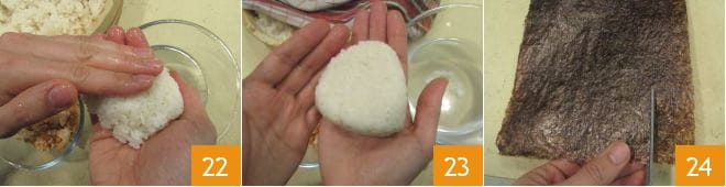 und bedecken Sie es mit einer weiteren Portion Reis 22, formen Sie dann den Reis zwischen Ihren Händen zu einem Dreieck 23. Beachten Sie, dass Sie für jedes Dreieck etwa 100 g Reis benötigen und mit diesen Mengen etwa 10 Onigiri erhalten. Nehmen Sie nun das Nori-Blatt und schneiden Sie es in Streifen von etwa 2 cm Breite 24