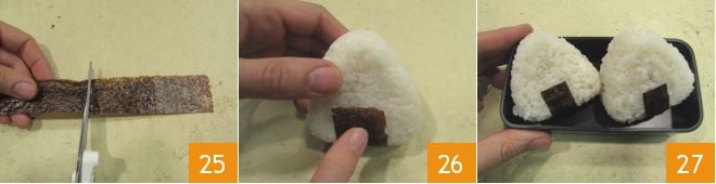und 5 cm Länge 25. Befestigen Sie die erhaltenen Streifen an der Basis jedes Onigiris, indem Sie auf den Reis drücken, bis sie von selbst haften bleiben 26. Ihre Onigiri sind bereit zum Genießen 27!
