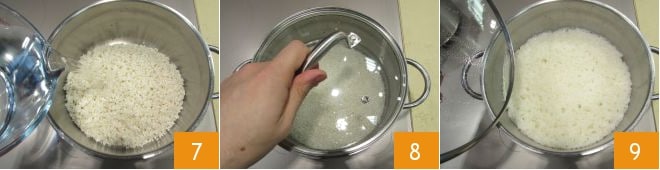 fügen Sie 600 g Wasser hinzu 7, decken Sie mit einem Deckel ab 8 und bringen Sie das Wasser bei mittlerer Hitze zum Kochen. Wenn das Wasser kocht, reduzieren Sie die Hitze auf ein Minimum und kochen Sie den Reis für etwa 12-13 Minuten weiter, immer mit Deckel. Nach dieser Zeit überprüfen Sie, ob der Reis das gesamte Wasser aufgenommen hat 9, schalten Sie dann die Hitze aus und lassen Sie den Reis im Topf mit dem Deckel weitere 10 Minuten ruhen.