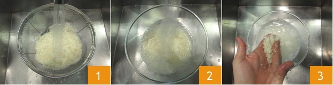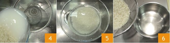 wechseln Sie dann das Wasser in der Schüssel, um die freigesetzte Stärke zu entfernen 4, und wiederholen Sie den Vorgang, bis das Wasser klar ist 5. An diesem Punkt geben Sie den Reis in einen Kochtopf 6,