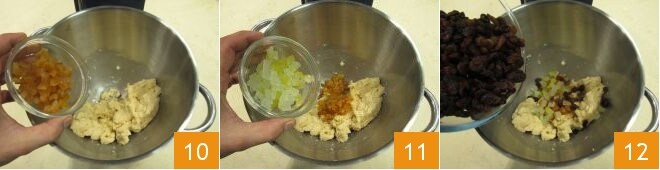 Wenn alles absorbiert ist, stoppen Sie die Küchenmaschine für einen Moment und fügen Sie die Orange 10, die Zitrone 11 und die zuvor unter fließendem Wasser abgespülten und getrockneten Rosinen hinzu 12.