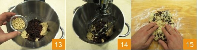 Zum Schluss die Pinienkerne 13 hinzufügen. Schalten Sie die Küchenmaschine erneut für ca. 10 Sekunden bei mittlerer Geschwindigkeit ein, um die Zutaten gut zu vermischen 14. Übertragen Sie dann den Teig auf eine Arbeitsfläche und formen Sie den Teig mit den Händen zu einer Kugel 15