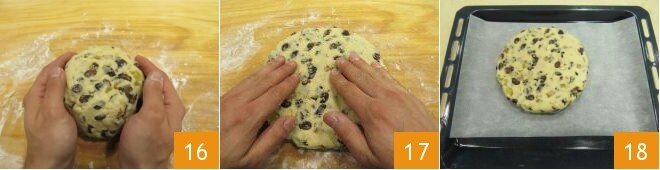 Geben Sie ihm eine runde Form 16. An diesem Punkt drücken Sie leicht mit den Händen die obere Seite des Teigstücks, um es leicht abzuflachen 17. Lassen Sie die Hände an den Rändern des Teigs entlang gleiten, um sie zu regulieren und dem Kuchen eine gut definierte Scheibenform zu geben: Sie erhalten eine Scheibe von etwa 3 cm Höhe und einem Durchmesser von 10 cm. Legen Sie ihn dann auf ein mit Backpapier ausgelegtes Backblech 18.