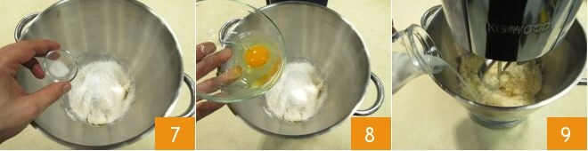 Fügen Sie das Salz 7 und das Ei 8 hinzu und beginnen Sie bei mittlerer Geschwindigkeit zu kneten. Während des Knetens fügen Sie die Milch bei Raumtemperatur in einem dünnen Strahl hinzu 9.