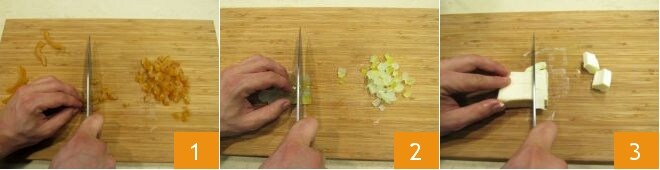 Um den Genueser Weihnachtskuchen zuzubereiten, beginnen Sie damit, die kandierte Orange 1 und die Kandiszitrone 2 in Würfel zu schneiden. Gehen Sie nun zur bei Raumtemperatur weichen Butter über, die Sie in Stücke schneiden 3.
