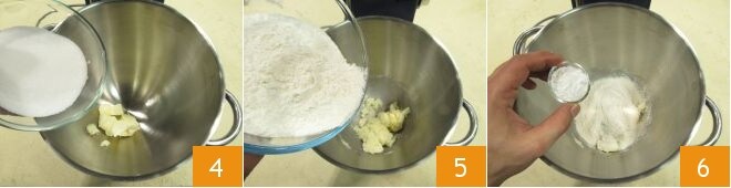 Nehmen Sie dann eine Küchenmaschine mit einem Flachrührer, in die Sie die Butter und den Zucker 4, das gesiebte Mehl 5 und das Backpulver 6 hinzufügen.