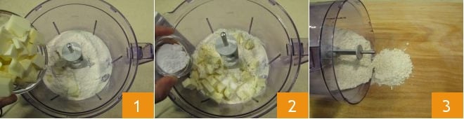 Um die Paprikakekse zuzubereiten, beginnen Sie damit, das Mehl und die in Stücke geschnittene kalte Butter in einen Mixer zu geben 1. Würzen Sie mit Salz und Pfeffer, fügen Sie das Backpulver hinzu 2 und mixen Sie, um die Mischung zu krümeln. Übertragen Sie die krümelige Masse auf die Arbeitsfläche 3,