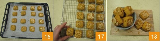 Dann bestreuen Sie sie mit gehackten Haselnüssen 13 und Mandelblättchen 14 und backen Sie die erste Charge Kekse im vorgeheizten Ofen, in der statischen Funktion, bei 200° für etwa 20 Minuten 15.