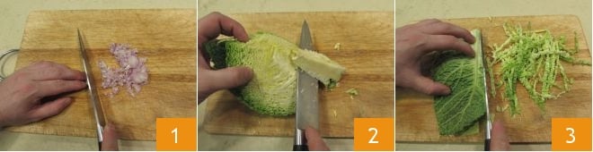 Um die Pasta mit Forelle zuzubereiten, beginnt damit, einen Topf mit reichlich Wasser auf den Herd zu stellen und salzt es, sobald es kocht. In der Zwischenzeit bereitet alle Zutaten vor, die ihr benötigt: reinigt und hackt die Schalotte fein 1, wascht und trocknet den Kohl, entfernt die äußeren Blätter und die Mittelrippe 2 und schneidet den restlichen Teil in Streifen 3.