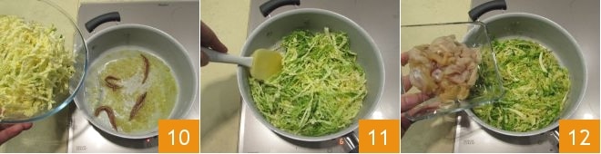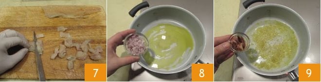 Schneidet die Forellenfilets in Stücke 7. Erhitzt eine Pfanne mit Olivenöl extra vergine, fügt die gehackte Schalotte hinzu 8 und lasst sie bei niedriger Hitze etwa 5 Minuten anbraten; sobald die Schalotte fast durchsichtig ist, fügt die abgetropften Sardellen aus dem Öl 9 hinzu