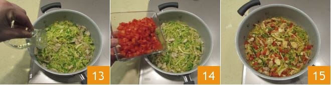 und löscht mit dem Weißwein ab 13, lasst ihn vollständig verdampfen. Zum Schluss fügt die Tomatenwürfel hinzu 14, schmeckt mit Salz und Pfeffer ab und kocht 5-6 Minuten unter gelegentlichem Rühren, dann schaltet den Herd aus 15.