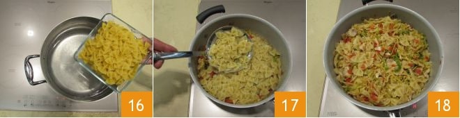 In der Zwischenzeit kocht die Farfalle in dem Topf mit gesalzenem, kochendem Wasser nach Belieben 16. Gießt die Pasta al dente ab und gebt sie in die Pfanne mit dem Dressing 17, rührt um, um alles zu vermischen 18, und serviert eure Pasta mit Forelle heiß!