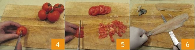 Spült die Tomaten ab, entfernt den grünen Teil des Stiels 4 und schneidet sie zuerst in Scheiben, dann in Würfel 5. Nehmt schließlich die Forellenfilets: entfernt die Haut, indem ihr das Messer vorsichtig entlang der Haut von der Schwanz- bis zur Kopfseite führt 6, und tastet das Fleisch mit den Fingern ab, um sicherzustellen, dass sich keine Gräten darin befinden: falls vorhanden, könnt ihr sie mit einer Küchenpinzette entfernen.