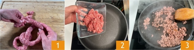 Um die Nudeln mit Kürbis und Wurst zuzubereiten, beginnen Sie mit letzterem. Entfernen Sie die Wurst aus der Hülle 1, zerbröckeln Sie sie mit den Händen und geben Sie sie in eine heiße Pfanne 2. Drücken Sie sie leicht mit einem Holzlöffel an und braten Sie sie für ein paar Minuten 3.