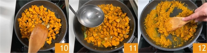 Fügen Sie den Kürbis hinzu, mischen Sie gut, damit er den Geschmack annimmt 10. Fügen Sie den mit einem Stück Schnur gebundenen Rosmarin hinzu und geben Sie eine Kelle Kochwasser hinzu 11. Kochen Sie bei mittlerer Hitze für 15-20 Minuten, dann entfernen Sie den Rosmarin und zerdrücken Sie den Kürbis, bis Sie ein Püree erhalten 12. Geben Sie noch eine Kelle Wasser hinzu.