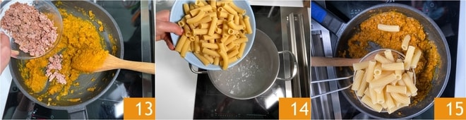 Geben Sie die Wurst zum Kürbispüree und mischen Sie 13. Kochen Sie die Tortiglioni 14, lassen Sie sie al dente abtropfen und geben Sie sie direkt in die Pfanne mit der Soße 15.
