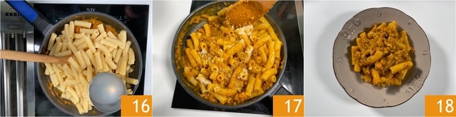 Geben Sie noch eine Kelle Kochwasser hinzu, falls erforderlich 16, und mischen Sie gut. Fügen Sie den geriebenen Parmigiano Reggiano DOP hinzu und mischen Sie erneut 17. Schwenken Sie die Nudeln eine Minute lang und servieren Sie sie 18.