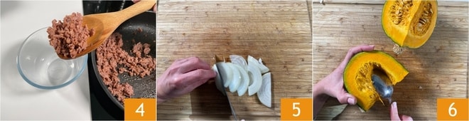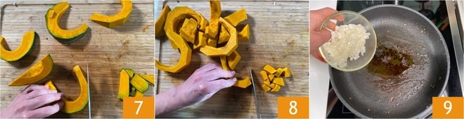 Entfernen Sie die Schale 7 und schneiden Sie den Kürbis in Würfel 8. Stellen Sie einen Topf mit gesalzenem Wasser auf den Herd, um die Nudeln zu kochen. In derselben Pfanne, in der Sie die Wurst gebraten haben, fügen Sie 2 Esslöffel Öl und die Zwiebel hinzu 9.