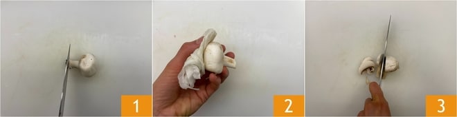 Um die Pasta mit Pilzen und Speck zuzubereiten, beginnen Sie mit der Reinigung der Champignons. Zuerst entfernen Sie mit einem Messer den unteren, erdigeren Teil der Wurzeln 1. Dann reinigen Sie die gesamten Pilze mit einem feuchten Tuch 2. Es ist wichtig, sie nicht unter Wasser zu waschen. Schneiden Sie die Champignons anschließend in Scheiben 3.