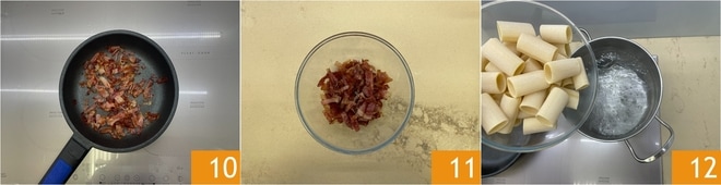 Bei mittlerer Hitze rösten, bis er knusprig ist 10, dann beiseite stellen 11. Sobald das Wasser kocht, die Paccheri kochen 12.