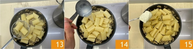Al dente abgießen und in die Pfanne mit den Pilzen geben 13; eine Kelle Kochwasser hinzufügen 14 und den Stracchino 15.