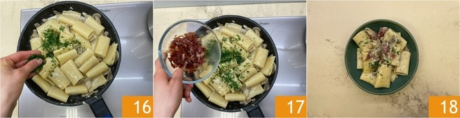 Gut anbraten, bis eine cremige Konsistenz erreicht ist. Falls nötig, eine weitere Kelle Kochwasser hinzufügen. Mit gehackter Petersilie 16 und etwa der Hälfte des Specks 17 abschließen. Anrichten und mit dem restlichen Speck dekorieren 18.