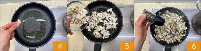 In einer großen Pfanne einen Schuss Öl und eine Knoblauchzehe 4 geben; die Hitze einschalten und anbraten lassen, dann die Pilze hinzufügen 5. Salz und Pfeffer 6 hinzufügen und ein paar Minuten kochen. In der Zwischenzeit einen Topf mit gesalzenem Wasser auf den Herd stellen, das zum Kochen der Pasta verwendet wird.