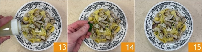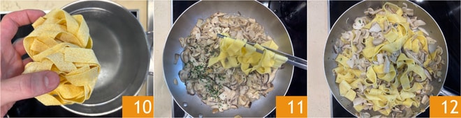 In der Zwischenzeit bringen Sie einen Topf mit gesalzenem Wasser zum Kochen und kochen Sie die Pappardelle 10. Die Pasta al dente abgießen und in die Pfanne mit den Pilzen geben 11, dann alles für ein paar Minuten durchschwenken 12; bei Bedarf können Sie etwas Kochwasser hinzufügen.