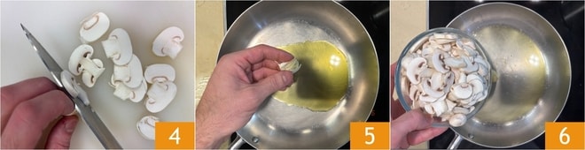 Schließlich reinigen und schneiden Sie auch die Champignons 4. In einer großen Pfanne erhitzen Sie das Öl mit der zerdrückten Knoblauchzehe 5, dann fügen Sie alle Pilze hinzu 6.
