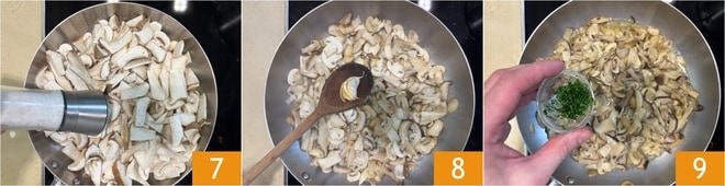 Salzen Sie 7 und kochen Sie bei mittlerer Hitze für etwa 10-12 Minuten, gelegentlich umrühren. Wenn die Pilze gut angebraten sind und das gesamte Wasser verdampft ist, schalten Sie die Hitze aus, entfernen Sie den Knoblauch 8 und würzen Sie mit gehackter Petersilie 9.