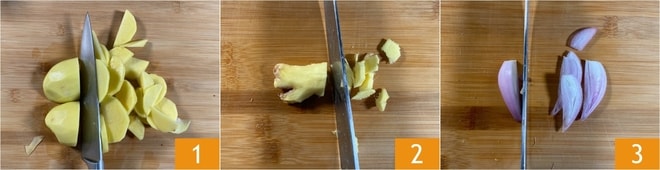 Um die Pennoni mit Kartoffelcreme und Pilzen auf den Tisch zu bringen, beginnen Sie mit der Zubereitung der Kartoffelcreme: Schälen Sie die Kartoffeln und schneiden Sie sie in recht dünne Scheiben 1. Schälen Sie den Ingwer und schneiden Sie ihn dünn 2, dann machen Sie dasselbe mit der Schalotte 3.