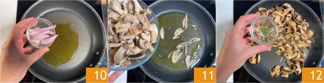 Erhitzen Sie das Öl in einer Pfanne und lassen Sie die Schalotte weich werden 10, dann fügen Sie die Pilze hinzu 11, salzen und würzen Sie mit gehacktem Rosmarin und abgezupftem Thymian 12. Kochen Sie bei mittlerer bis hoher Hitze 4-5 Minuten lang.